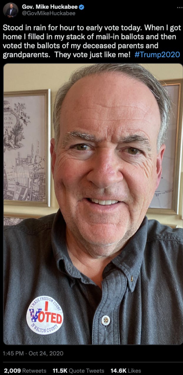 31. In one ridiculous case, former Arkansas governor Mike Huckabee joke-tweets about mailing in ballots for his “deceased parents and grandparents.”