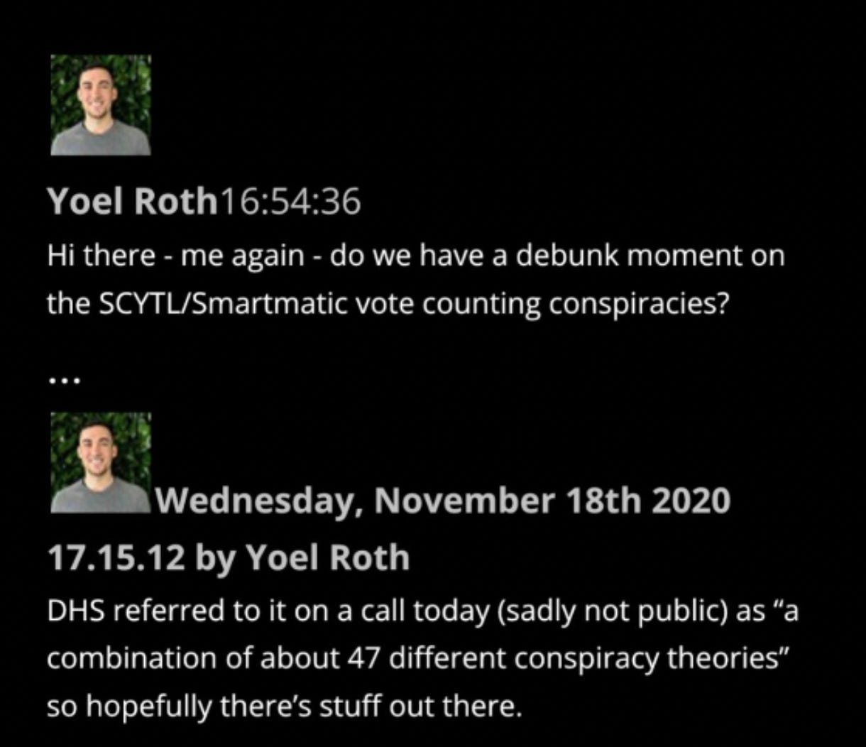 44. Later in November 2020, Roth asked if staff had a “debunk moment” on the “SCYTL/Smartmantic vote-counting” stories, which his DHS contacts told him were a combination of “about 47” conspiracy theories: