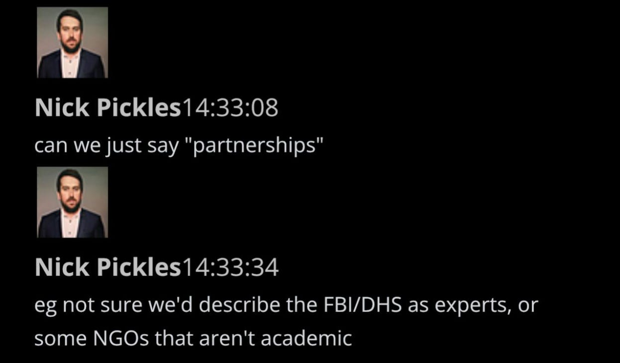 19. Pickles quickly asks if they could “just say “partnerships.” After a pause, he says, “e.g. not sure we’d describe the FBI/DHS as experts.”