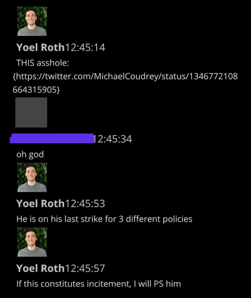 Roth groans about Coudrey: “THIS asshole,” but still seems determined to stick at least superficially to rules, itching to act “if” this “constitutes incitement.