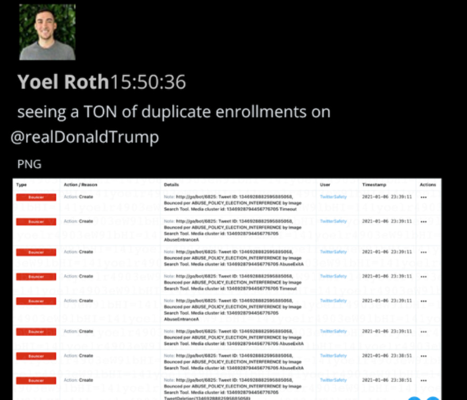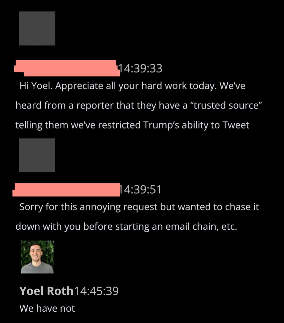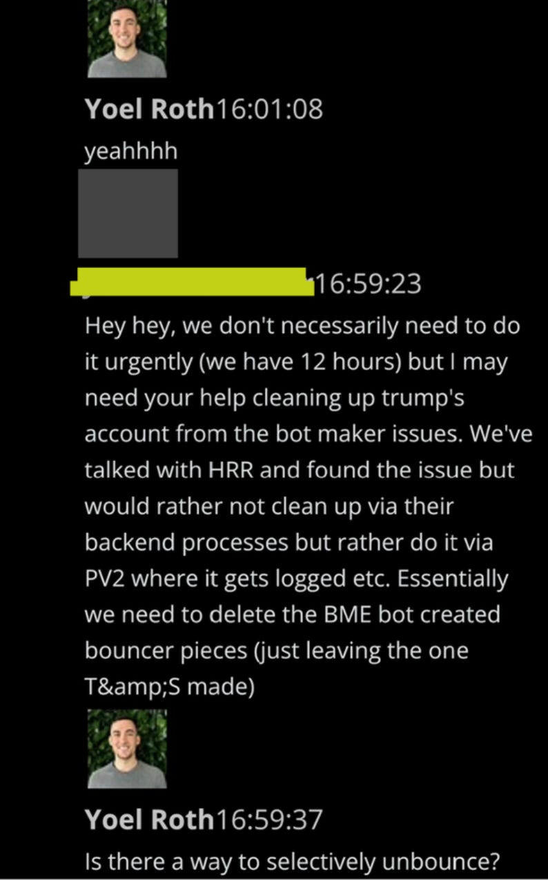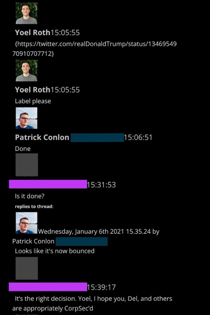 Technically this was true, but just minutes later, Roth executed the historic decision to “bounce” Trump, i.e. put him in timeout. “I hope you… are appropriately CorpSec’d,” says a colleague.