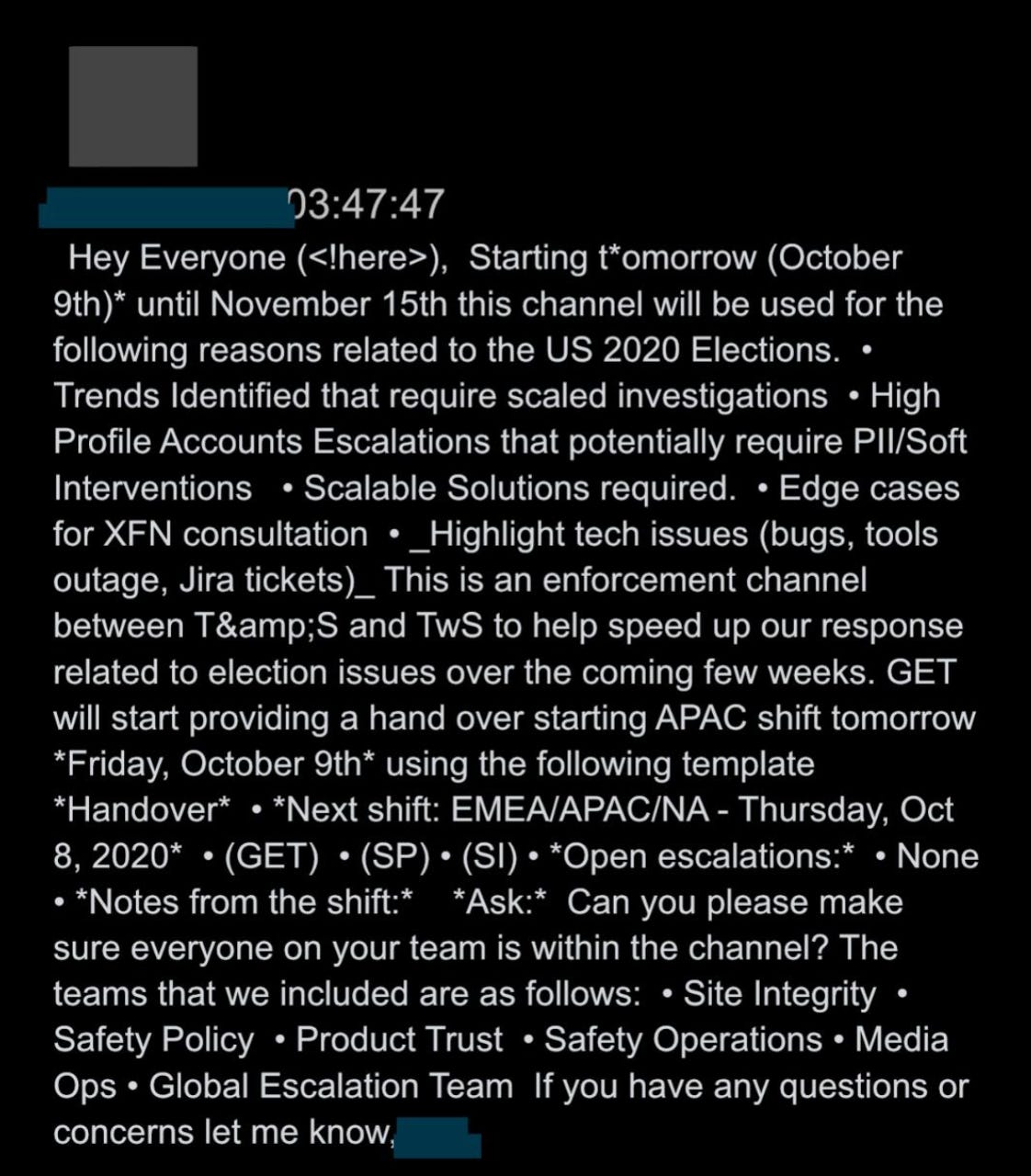 14. On October 8th, 2020, Twitter executives opened a slack channel called “us2020_xfn_enforcement.” Through J6 and beyond, this would be the home for discussions about election-related removal decisions, especially ones that required “scaled investigations” or involved “high-profile” accounts (often called “VITs” or “Very Important Tweeters”), and “edge cases” requiring senior input.