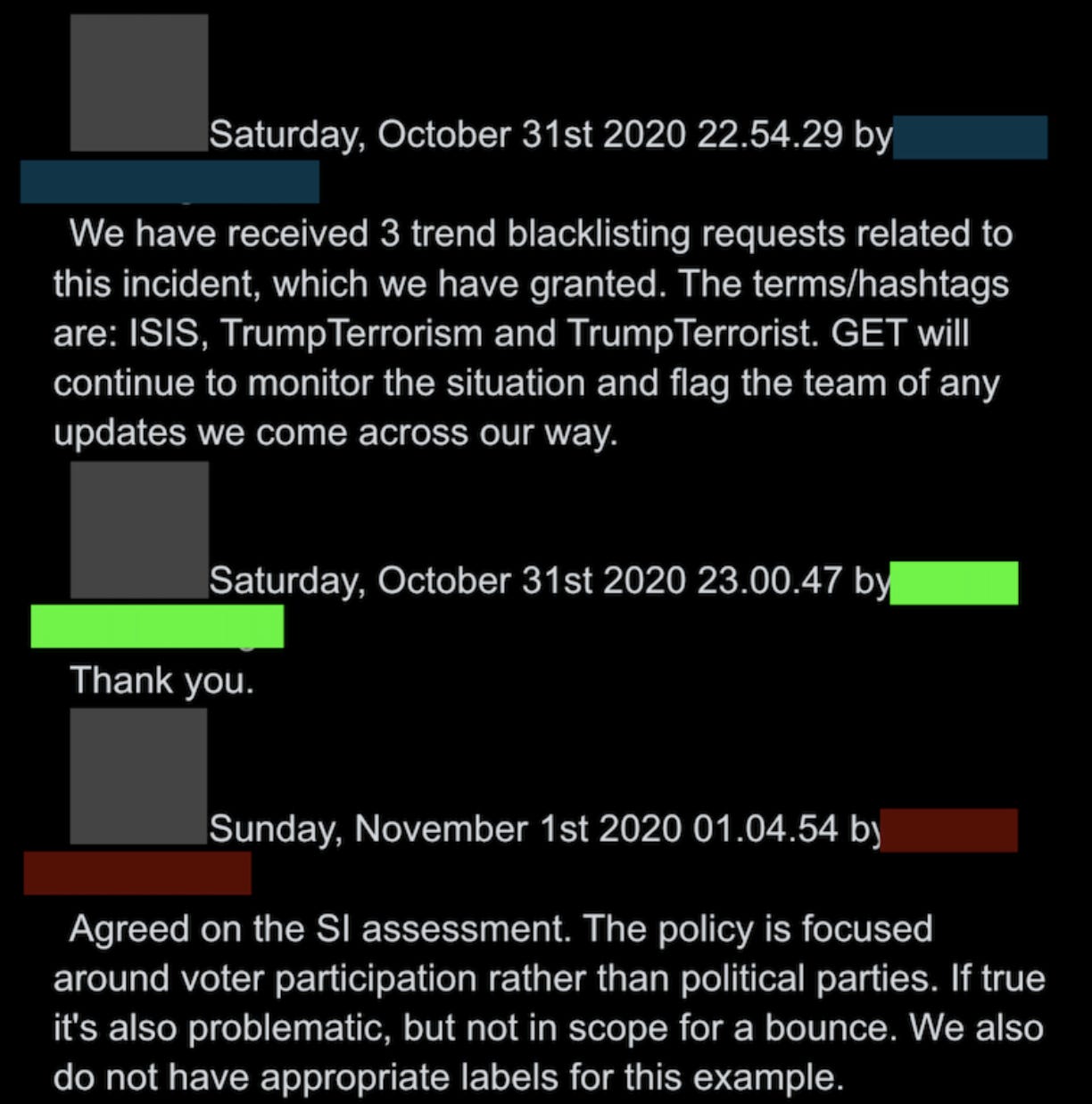 30. Moreover, while we found references in other data sets of action against left-wing sites (below, see former CEO Jack Dorsey intervening on behalf of the World Socialist Web Site), in the 2020 election enforcement slack we mostly found a double-standard in blue-red moderation attitudes bordering on the absurd.