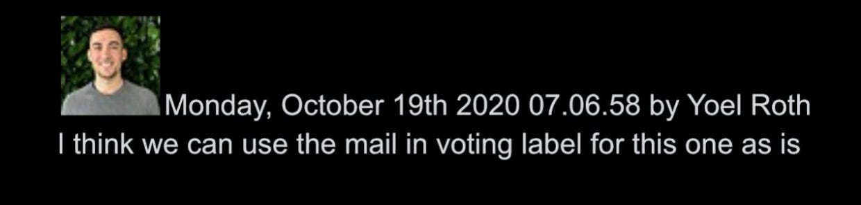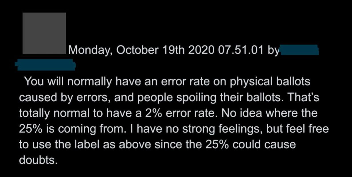26. The group then decides to apply a “Learn how voting is safe and secure” label because one commenter says, “it’s totally normal to have a 2% error rate.” Roth then gives the final go-ahead to a process initiated by the FBI: