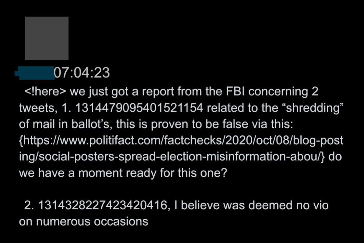 25. The FBI report then got circulated in the enforcement slack. It appears Twitter cited Politifact to say the first story was “proven to be false,” then noted the second was already deemed “no vio on numerous occasions.”