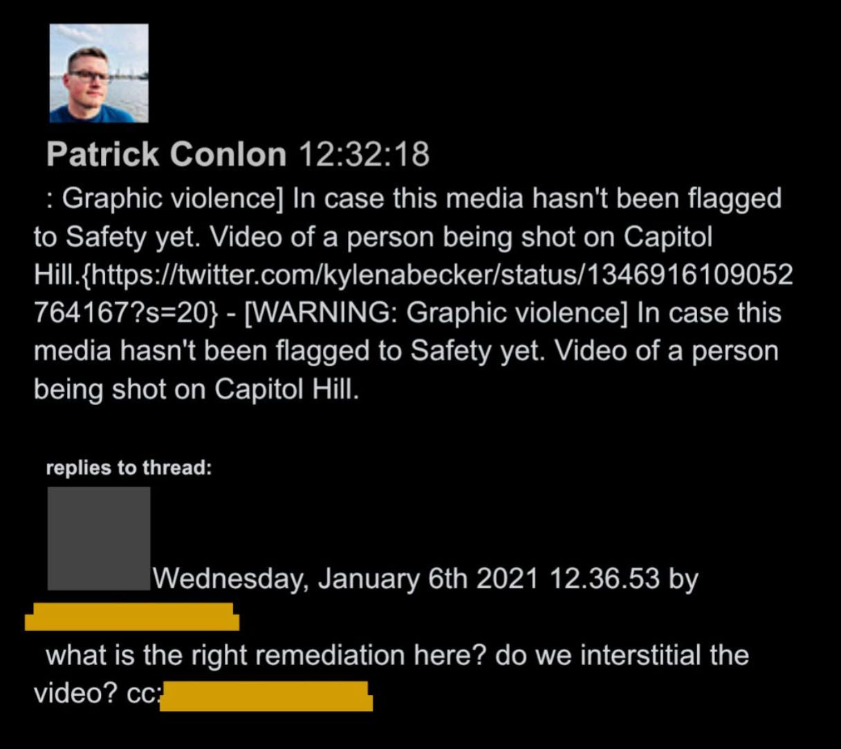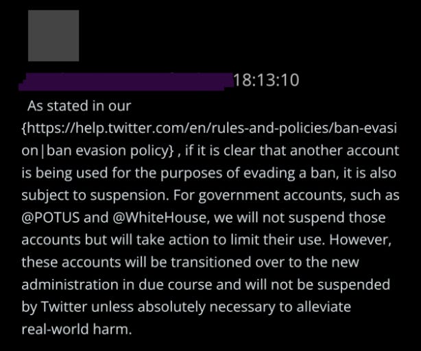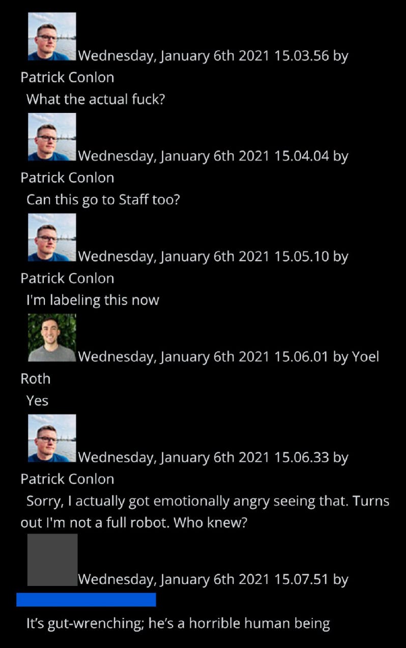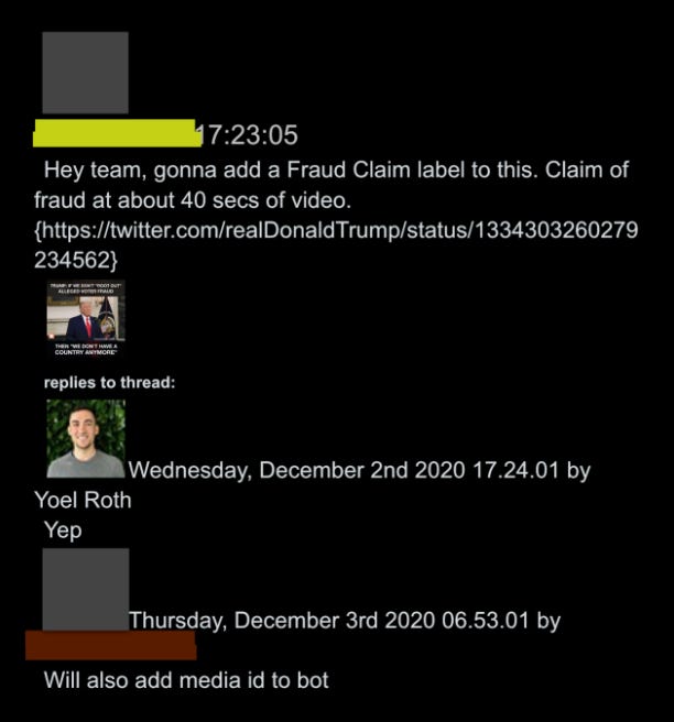 5. Whatever your opinion on the decision to remove Trump that day, the internal communications at Twitter between January 6th-January 8th have clear historical import, in addition to being controversial. Even Twitter’s employees – who at times seem overwhelmed by the weight of it all – understand it’s a landmark moment in speech enforcement.