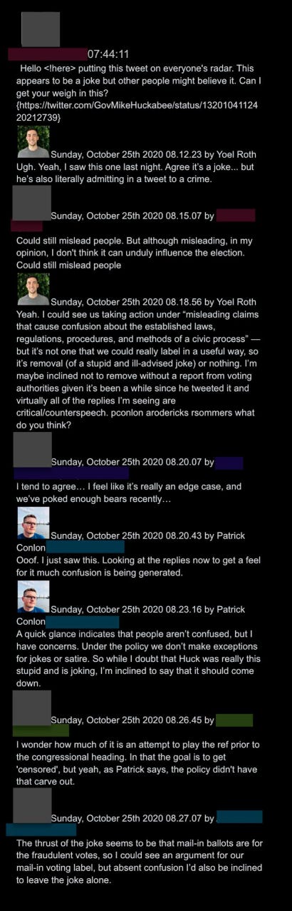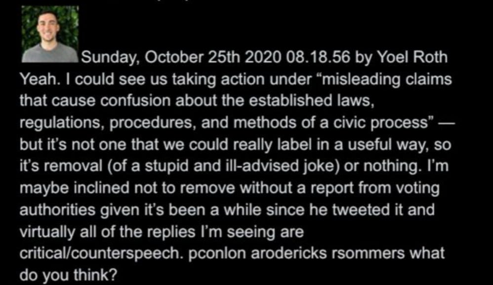 33. Roth suggests moderation even in the above absurd case will depend on whether or not the joke results in “confusion.” This sounds silly but is actually important. In the docs, Twitter OPS staff are seen working factory-style to flag content based on clear protocols, while policy execs constantly expand criteria to subjective issues like intent (yes, the video is authentic, but why was it shown?), orientation (was a screenshot of a banned tweet shown to condemn, or express support?), or reception (does a joke cause “confusion”?). This thought reflex will become key after J6.