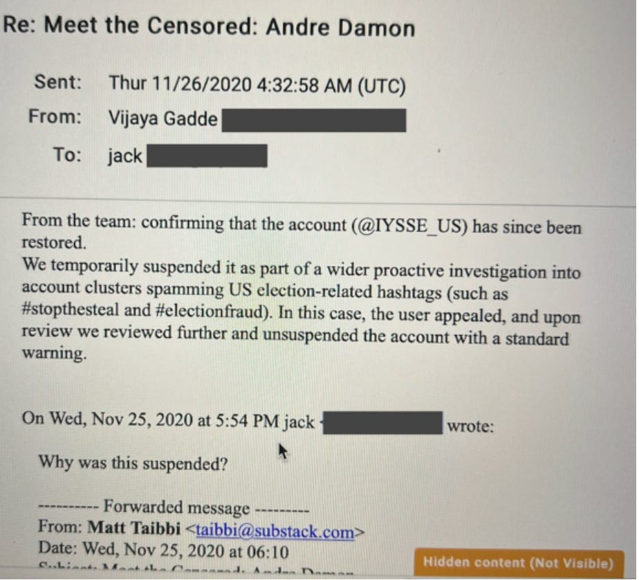 The significance of these and other exchanges is that it shows that Twitter, in 2020 at least was deploying a vast range of visible and invisible tools to rein in Trump’s engagement, long before J6.