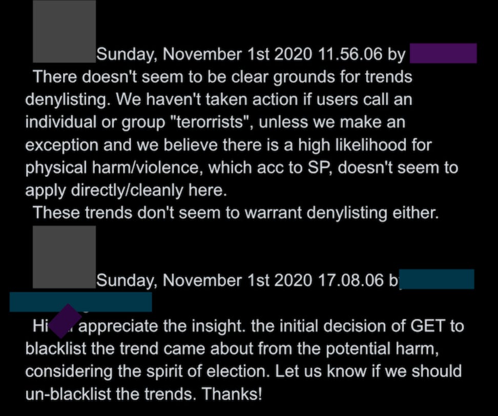 29. ”There doesn’t seem to be clear grounds for trends denylisting,” comes the reply, meaning the group doesn’t believe those terms should be “visibility filtered” by preventing them from trending.
