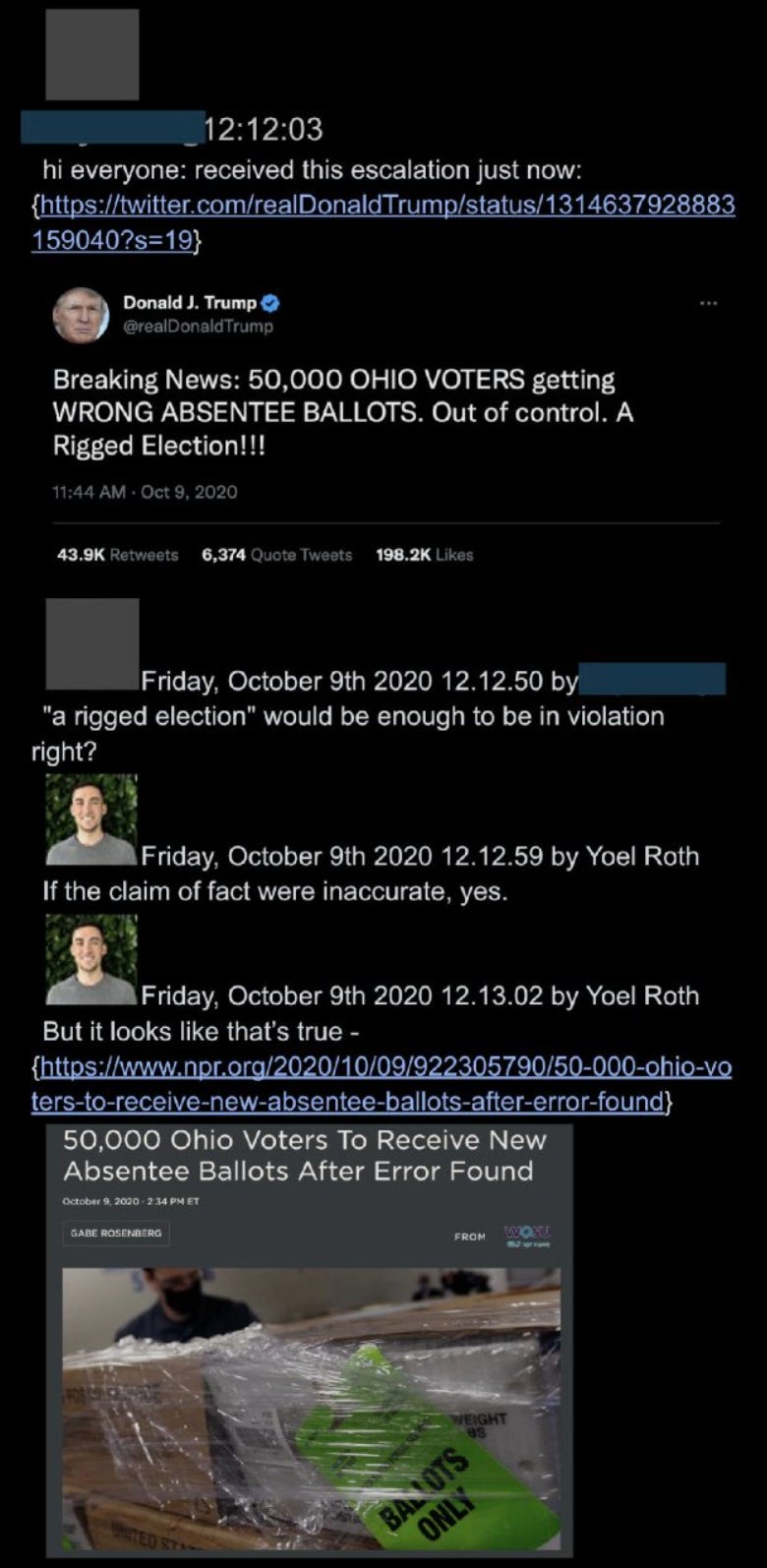 34. In another example, Twitter employees prepared to slap a “mail-in voting is safe” warning label on a Trump tweet about a postal screwup in Ohio, before realizing “the events took place,” which meant the tweet was “factually accurate”: