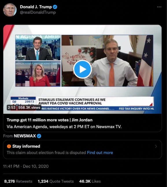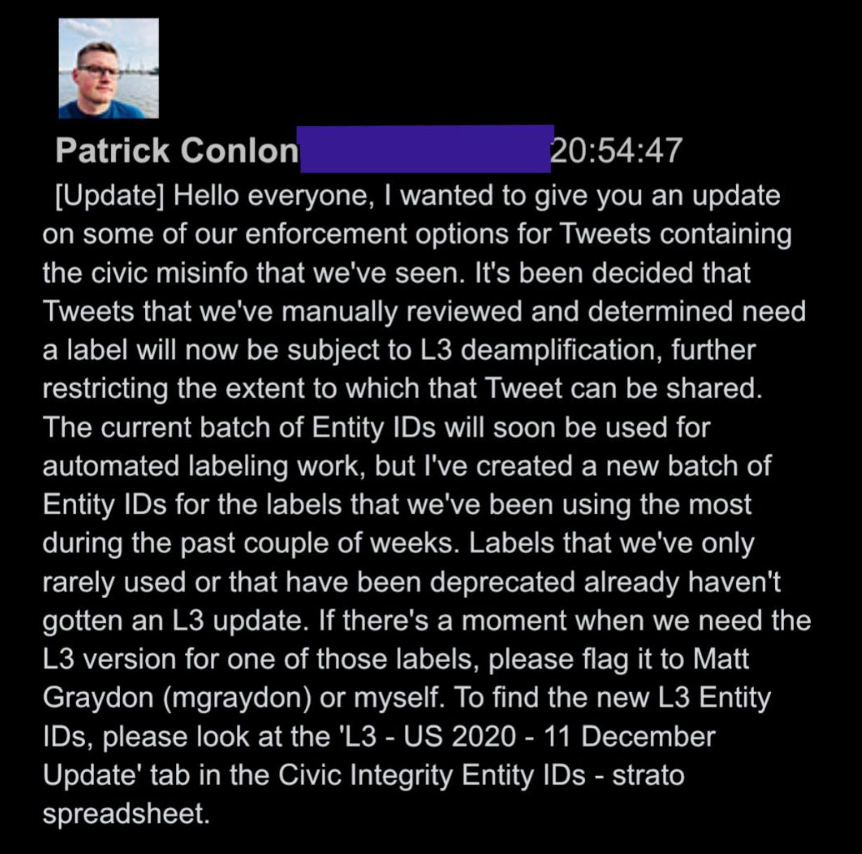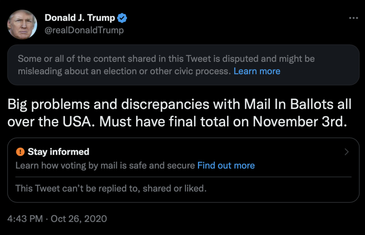 45. On December 10th, as Trump was in the middle of firing off 25 tweets saying things like, “A coup is taking place in front of our eyes,” Twitter executives decided they’d had enough, and announced a new “L3 deamplification” policy, seemingly designed specifically for this situation: