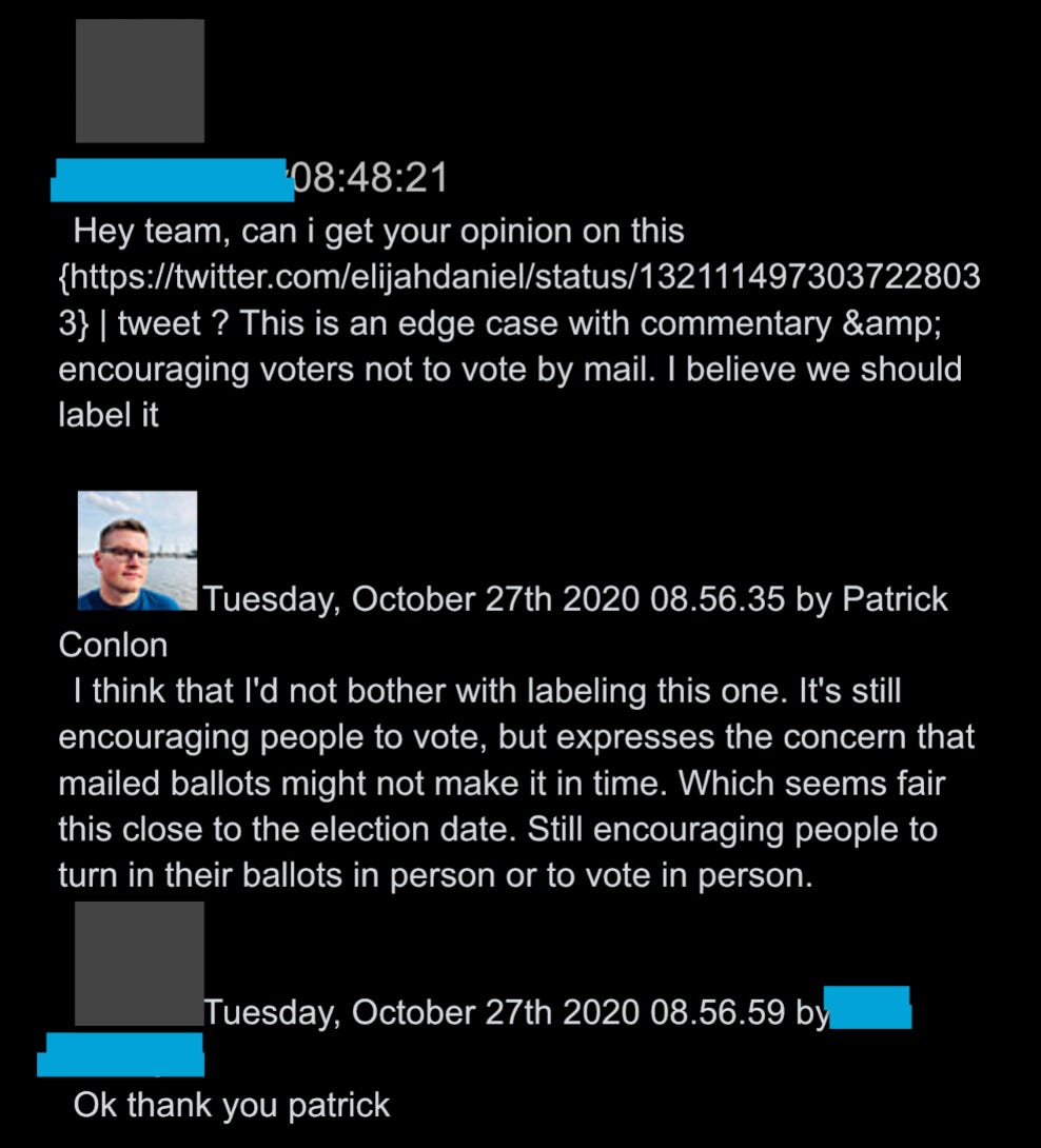 40. Meanwhile, there are multiple instances of pre-election tweets involving pro-Biden tweets warning Trump “may try to steal the election” that get surfaced, only to be approved by senior executives. This one, they decide, just “expresses concern that mailed ballots might not make it on time.”