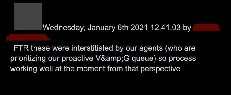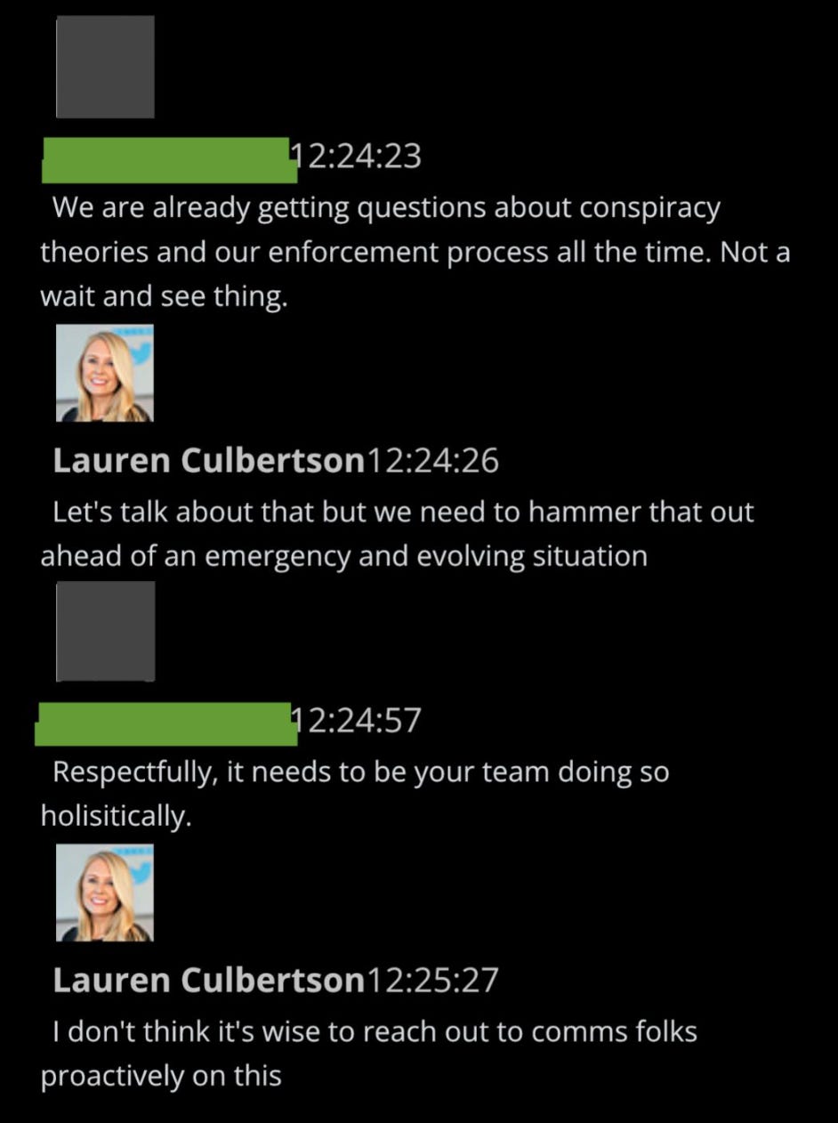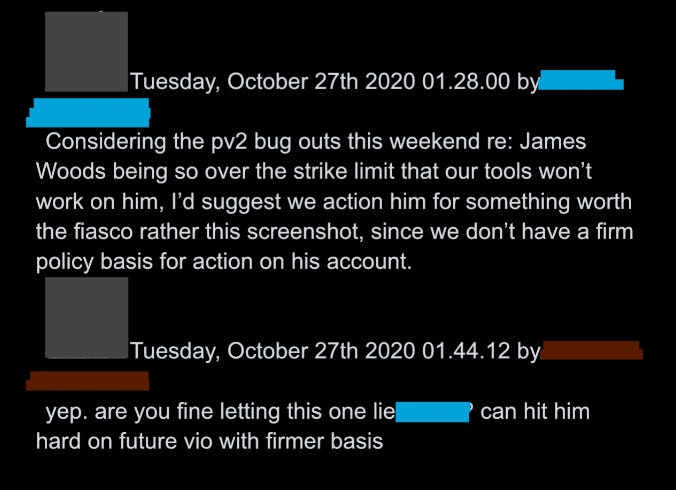 10. As the election approached, and then after, when tensions soared as Trump insisted he’d won, senior executives – perhaps under pressure from federal law enforcement and intelligence agencies, with whom they met more as time progressed – increasingly viewed rules as annoyances, and began to speak of “vios” as mere pretexts to do what they would likely have done anyway.