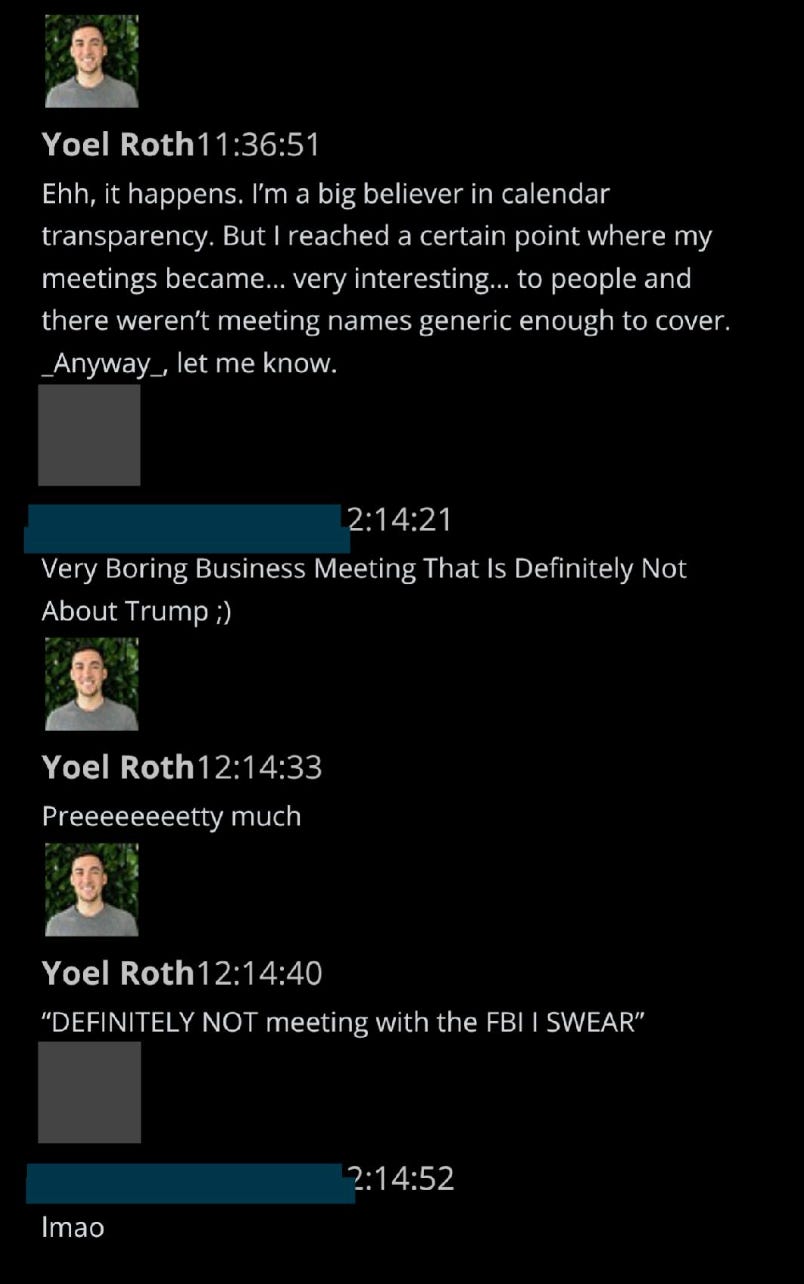 11. Within weeks after J6, internal slack chats showed Twitter executives reveling in newly heightened roles as public-facing extensions of the intelligence community. Here’s Trust and Safety head Yoel Roth, Twitter’s de facto chief censor, lamenting his lack of “generic enough” calendar descriptions for use in concealing the identities of his “very interesting” meeting partners. This is 1/26/2022: