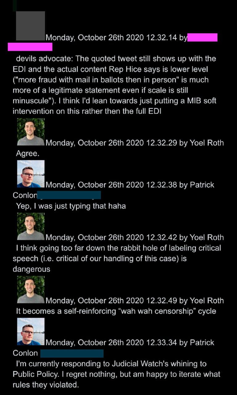39. Twitter teams go easy on Hice, only applying “soft intervenion,” with Roth worrying about a “wah wah censorship” optics backlash:
