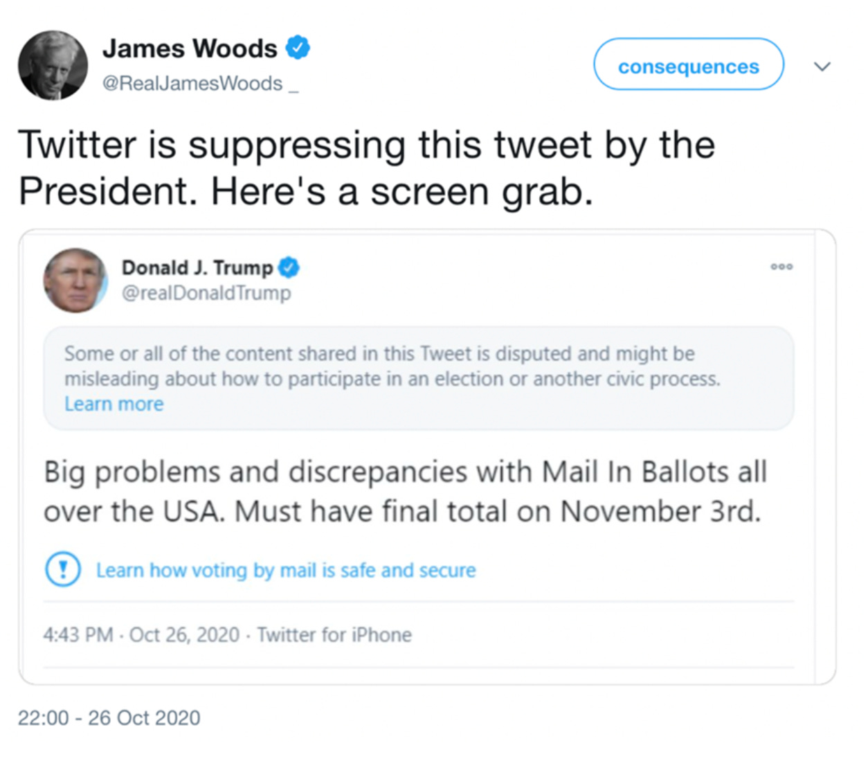 36. A seemingly innocuous follow-up involved a tweet from actor @realJamesWoods, whose ubiquitous presence in controversial Twitter data sets is already a #TwitterFiles in-joke.