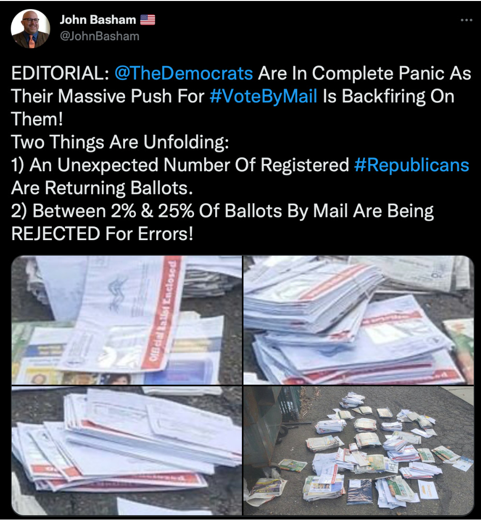 24. How did the government flagging system work? Here, the FBI sends reports about a pair of tweets, the second of which involves a former Tiipecanoe County, Indiana Councilor and Republican named @JohnBasham claiming “Between 2% and 25% of Ballots by Mail are Being Rejected for Errors.” Part of the reason this is slow work is that we have to manually load in things like the ID number of Basham’s tweet to figure out what they’re discussing.