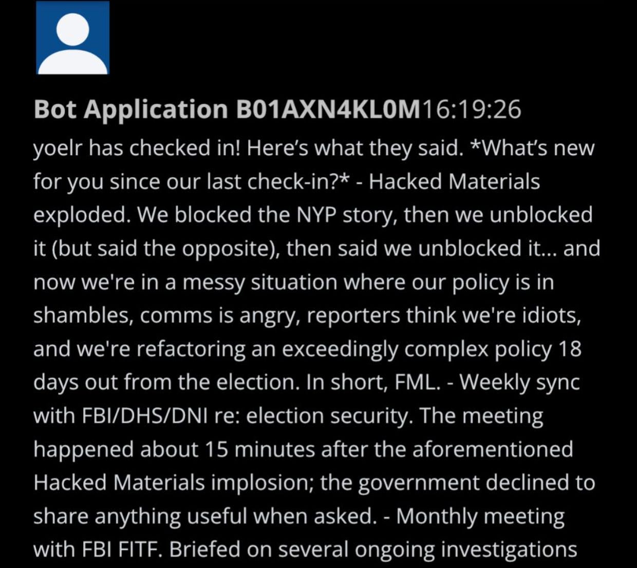 The following post about the laptop FUBAR shows Roth not only met weekly with the FBI and DHS, but with the Office of the Director of National Intelligence (DNI). Roth’s report to FBI/DHS/DNI about blocking the Hunter Biden laptop story on “hacked materials” grounds is almost farcical in its self-flagellating tone: