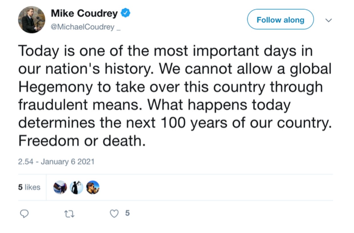 Early on January 6th Twitter execs show a ton of shock, but still seem superficially tied to rules. This “Freedom or Death” tweet from National #StopTheSteal gadfly Mike Coudrey elicits colorful reactions: