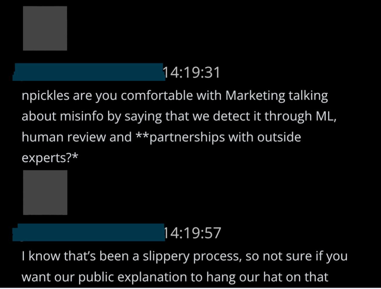 18. Here, Policy Director Pickles answers a query from Marketing. He’s asked if they should say Twitter detects “misinfo” through “[machine learning], human review, and **partnerships with outside experts?*” The employee adds, “I know that’s been a slippery process… not sure if you want our public explanation to hang on that.”