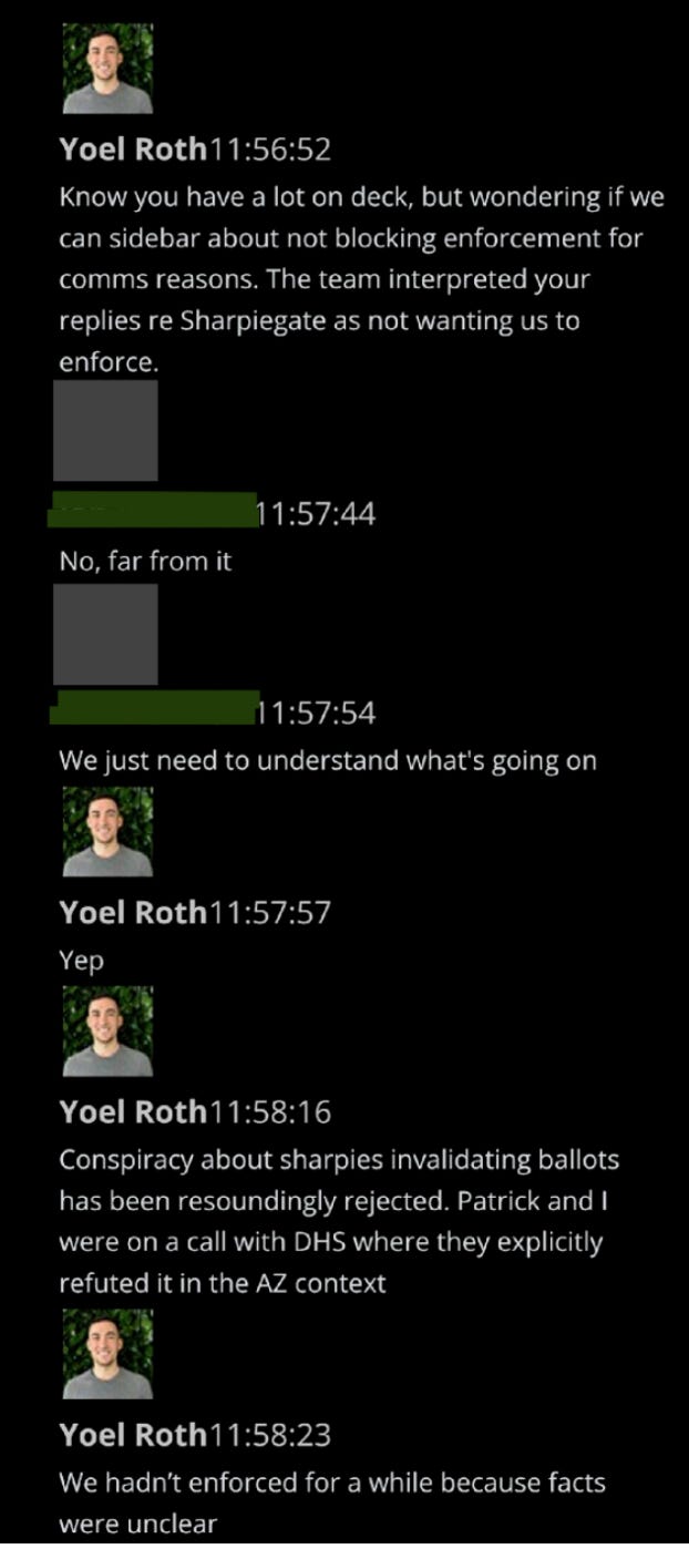 27. Examining the entire election enforcement slack, we didn’t see one reference to moderation requests from the Trump campaign, the Trump White House, or Republicans generally. We looked. They may exist elsewhere. We were told they do. However, in this channel, they were absent.